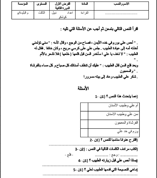 النموذج الرابع الاختبار و الفرض الكتابي الأول في مادة اللغة العربية في القراءة السنة الثالثة ابتدائي خلال الأسدس الدورة الثانية