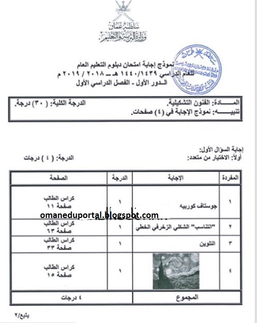 نموذج اجابة اختبار الفنون التشكيلية للصف الثاني عشر الفصل الاول 2018 2019 الدور الاول