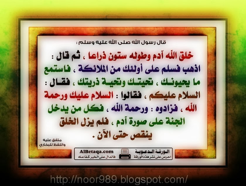 خلق الله ادم وطوله ستون ذراعا ثم قال اذهب فسلم علي اولئك من الملائكة مدونة نور الكتاب والسنة